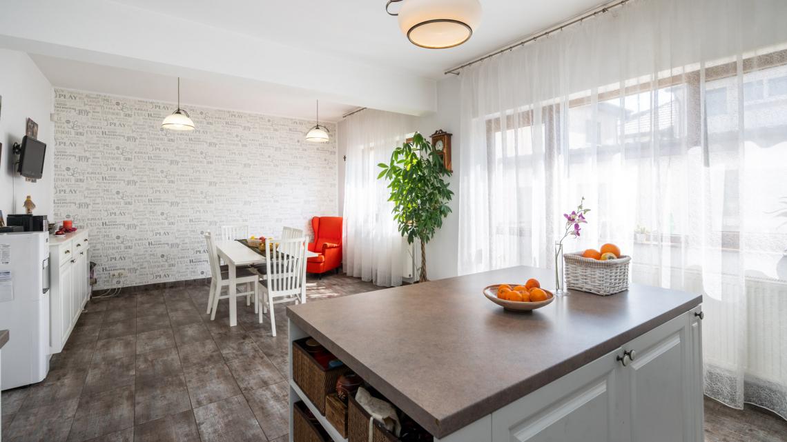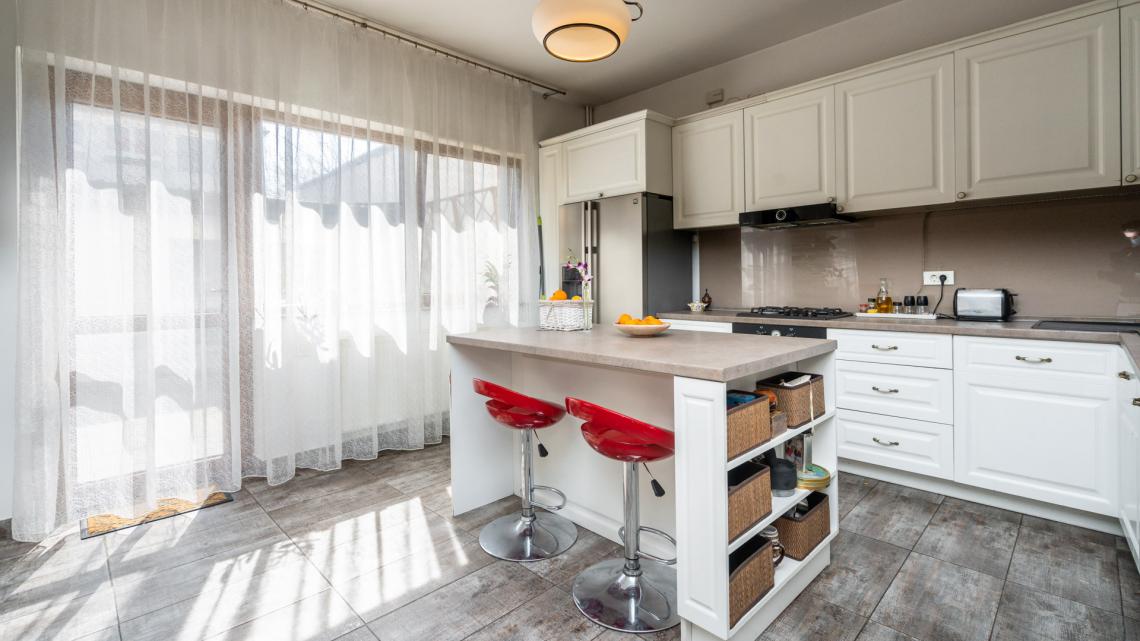 - parterul este format din living, dressing, camera tehnica, bai si o bucatarie foarte frumoasa de 30 mp cu insula, loc de luat masa dar si acces spre terasa